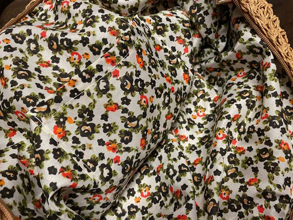 This tan straw tote features a spacious squared design with a side pocket, ideal for everyday summer use or as a beach bag. It includes a floral-printed interior liner and black PU leather shoulder straps for durability and style. Customizable and practical, it also works well as a grocery bag.